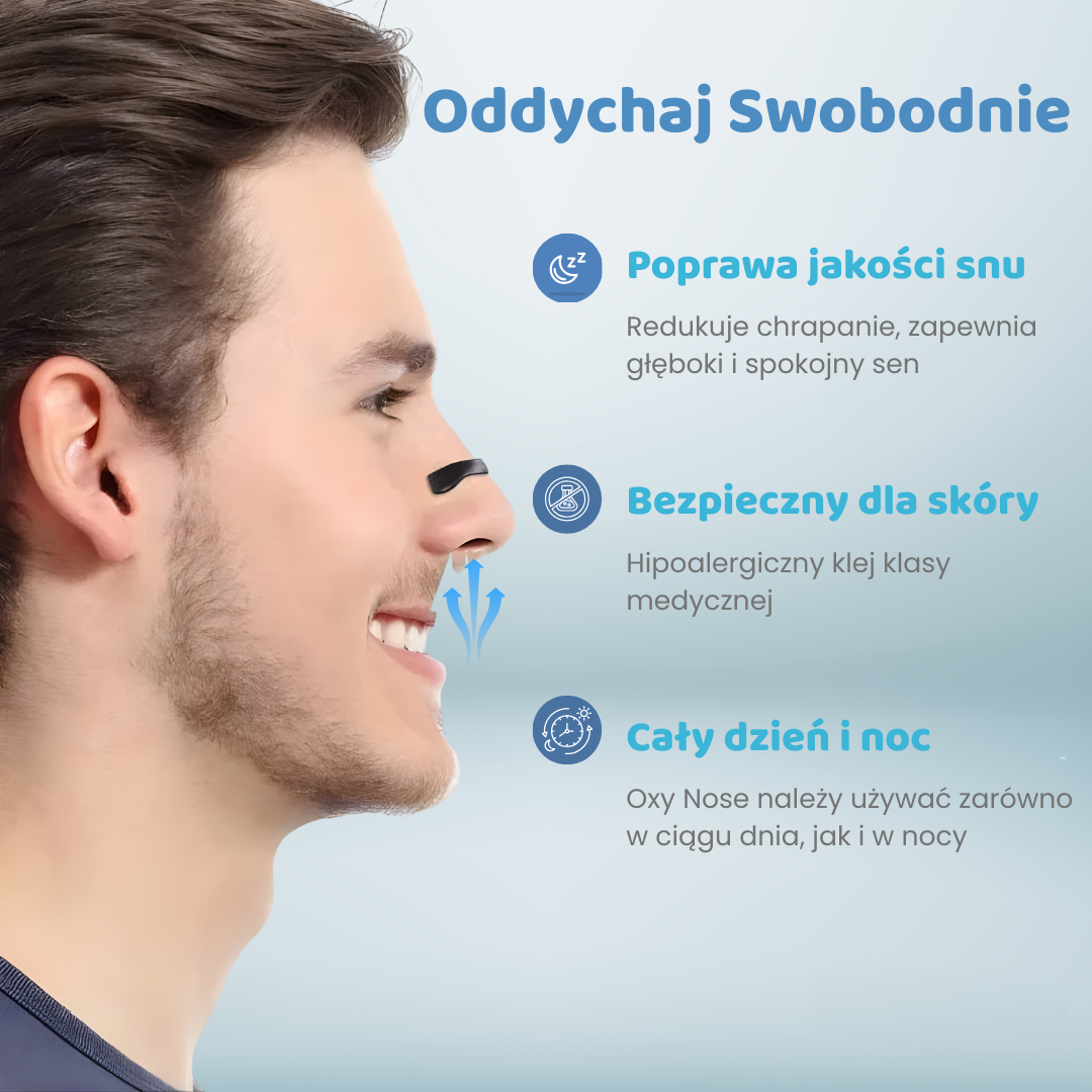 Oxy Nose otwiera nozdrza tak, aby powietrze mogło swobodnie przepływać. To szybka ulga, lepszy sen i łatwiejsze funkcjonowanie na co dzień.